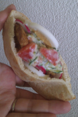 A pitában volt csirke, főtt tojás, retek és "hamis tzatziki", de a lehetőségek tárháza természetesen végtelen. Ezúttal - is - közel-keletire vettem a figurát, mert azt nagyon szeretjük. A csirkét csíkokra vágtam, szójaszósz és Ras al-Hanut keverékébe pácoltam, majd vaslábosban megsütöttem, hogy egy kicsit lepiruljon. De a dologban az igazi mestermű a "hamis tzatziki" lett véletlenül, pedig igazi maradékfeldolgozó akció volt.